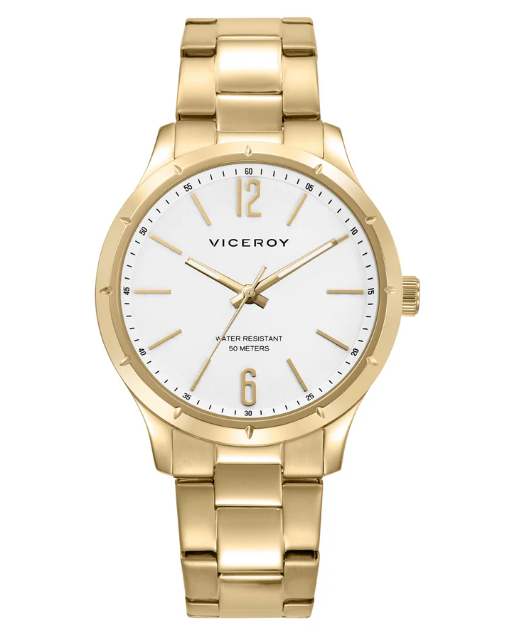 Con una presencia refinada y luminosa, este reloj de hombre de Viceroy apuesta por la elegancia del dorado como sello de distinción. Su caja de acero IP dorado y el brazalete a juego crean una estética envolvente y sofisticada, realzada por una esfera blanca de líneas limpias que aporta equilibrio y claridad visual. Las agujas horarias en color IP dorado completan un conjunto armonioso y atemporal, mientras el movimiento de cuarzo garantiza precisión en el día a día. Además, su cristal mineral y su resistencia al agua de 5 ATM lo convierten en una propuesta tan estilosa como funcional, ideal para acompañar looks formales o elevar un estilo urbano con un toque exclusivo