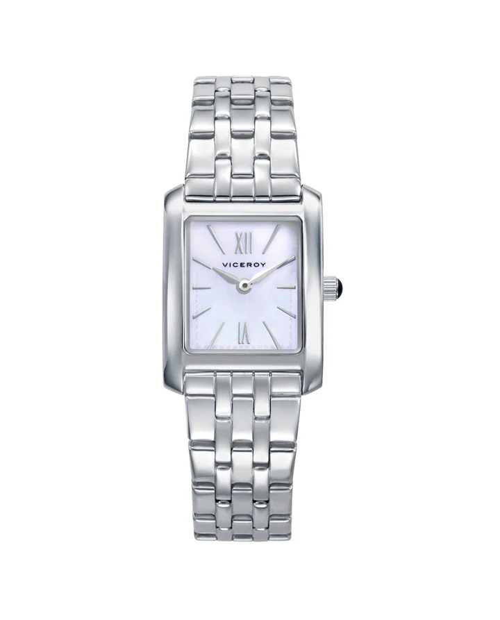 Con una presencia elegante y refinada, este reloj de mujer de Viceroy interpreta la sofisticación en clave contemporánea. Su caja de acero en formato rectangular, junto con el brazalete de acero a juego, aporta una estética pulida y versátil que eleva cualquier look con naturalidad. La esfera de madreperla blanca aporta luminosidad y un acabado delicado, realzado por índices y números romanos que refuerzan su carácter clásico. Las agujas horarias en color plata completan un diseño equilibrado y femenino, mientras el cristal mineral protege la pieza con discreción. Un reloj pensado para acompañar cada día con estilo y una elegancia que nunca pasa desapercibida.
