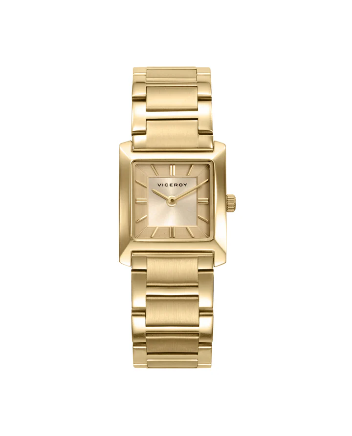 Elegancia dorada en su expresión más refinada. Este reloj de mujer combina una caja de acero IP dorado con un brazalete a juego que aporta presencia y luminosidad al conjunto. Su esfera dorada, limpia y equilibrada, se realza con índices discretos y agujas de horas en tono dorado, creando una estética sofisticada y atemporal. Equipado con movimiento de cuarzo analógico de 2 agujas y cristal mineral, es una pieza pensada para acompañar con estilo el ritmo de cada día